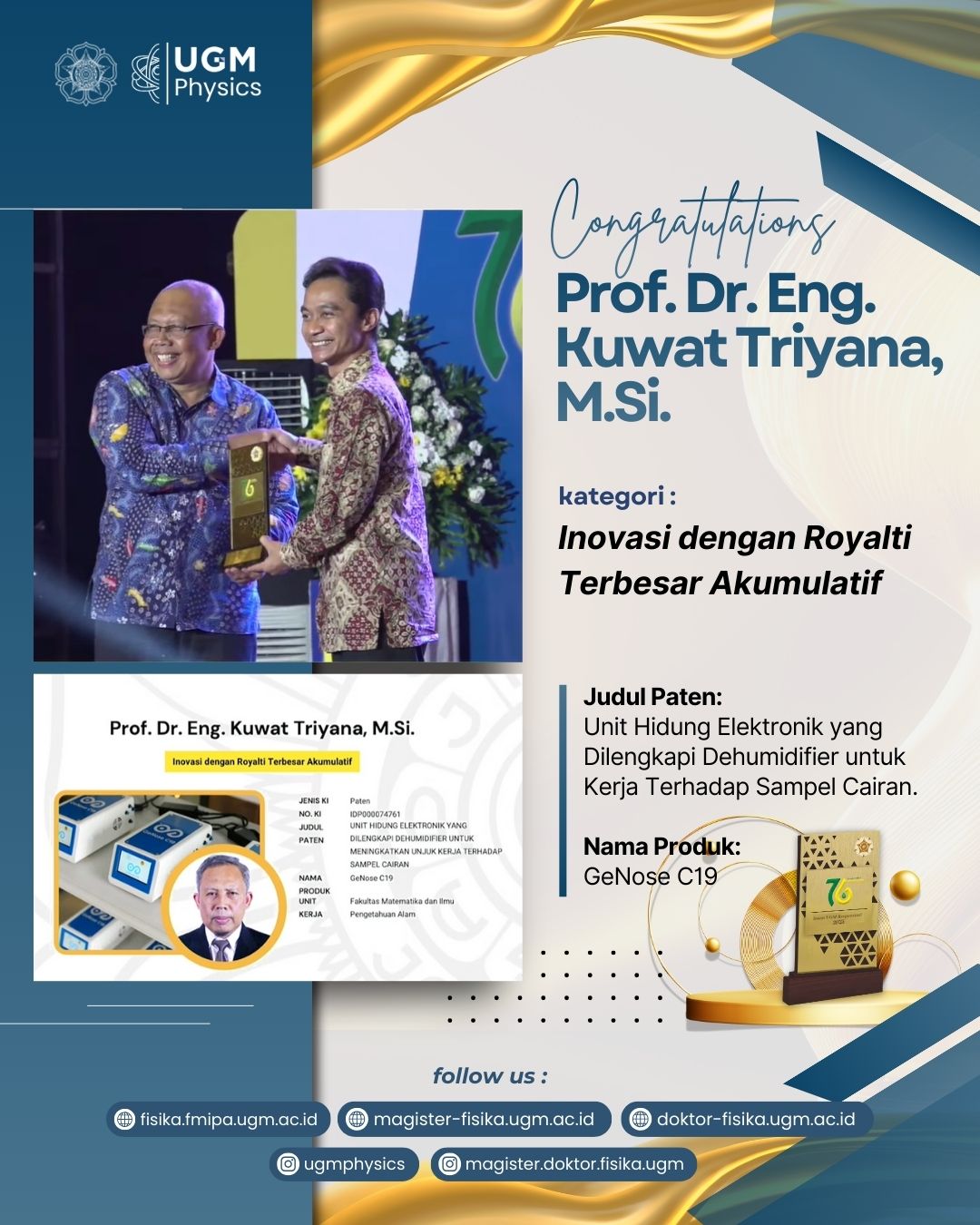 Salah satu penghargaan tahun ini diberikan kepada Prof. Dr. Eng. Kuwat Triyana, M.Si., yang meraih kategori “Inovasi dengan Royalti Terbesar Akumulatif.” Inovasi yang dikembangkan berupa Unit Hidung Elektronik yang Dilengkapi Dehumidifier untuk Kerja Terhadap Sampel Cairan, yang kemudian melahirkan produk hilirisasi GeNose C19. GeNose telah menjadi salah satu inovasi berbasis fisika yang paling dikenal masyarakat karena kontribusinya dalam mendukung deteksi cepat pada masa pandemi. Penghargaan ini menegaskan konsistensi Prof. Kuwat dalam menghadirkan riset yang tidak hanya unggul secara akademik, tetapi juga berdaya guna bagi masyarakat luas.
