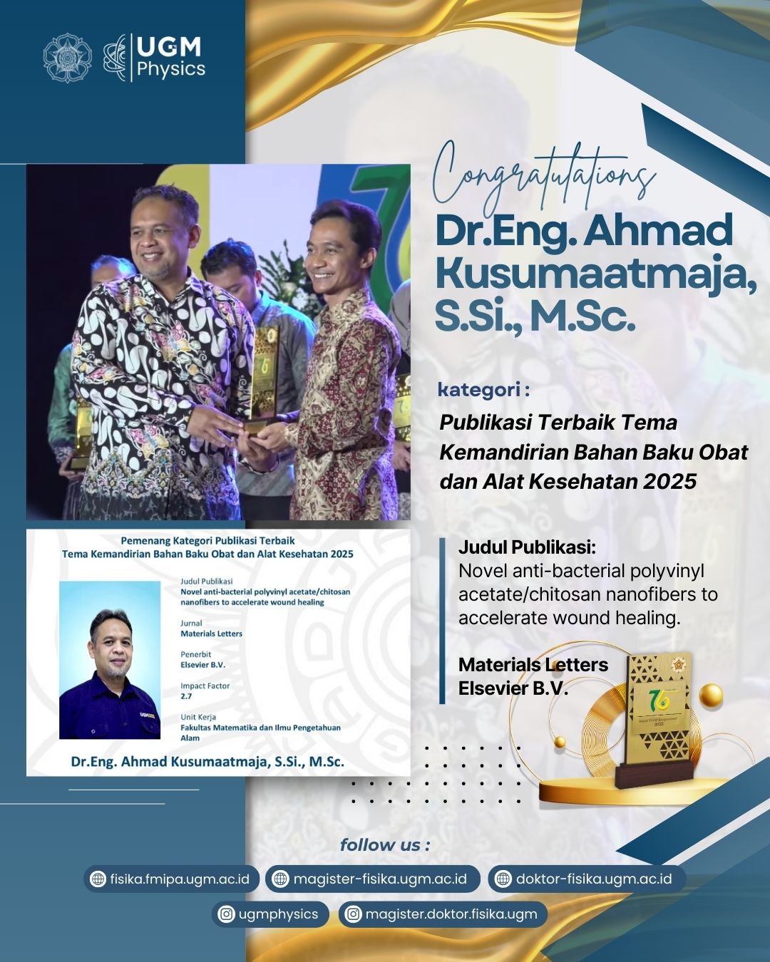 Selain itu, Dr. Eng. Ahmad Kusumaatmaja, S.Si., M.Sc. turut memberikan kebanggaan bagi Departemen Fisika dengan meraih penghargaan “Publikasi Terbaik Tema Kemandirian Bahan Baku Obat dan Alat Kesehatan 2025.” Penelitian yang dihasilkan berjudul “Novel anti-bacterial polyvinyl acetate/chitosan nanofibers to accelerate wound healing” dan dipublikasikan di jurnal internasional bereputasi tinggi, Materials Letters (Elsevier B.V.). Karya ini berkontribusi signifikan dalam pengembangan material kesehatan antibakteri yang berpotensi membantu inovasi dalam proses penyembuhan luka serta mendukung kemandirian bahan baku medis di Indonesia.