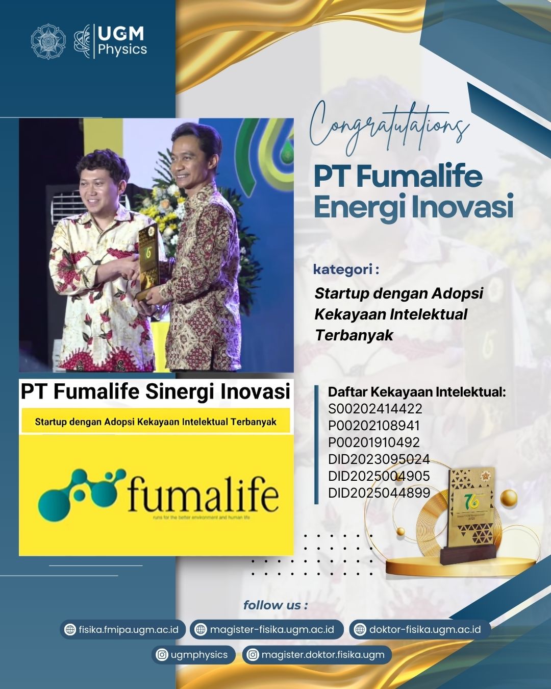 Prestasi berikutnya datang dari mitra startup Departemen Fisika UGM, yaitu PT Fumalife Sinergi Inovasi, yang berhasil meraih kategori “Startup dengan Adopsi Kekayaan Intelektual Terbanyak.” Startup ini telah secara aktif mengadopsi berbagai paten hasil penelitian UGM, khususnya dalam bidang lingkungan dan kesehatan, dan menerapkannya dalam bentuk produk serta layanan yang berdampak langsung pada masyarakat. Penghargaan ini mencerminkan keberhasilan hilirisasi riset Fisika UGM melalui kolaborasi berkelanjutan antara akademisi dan pelaku industri.