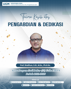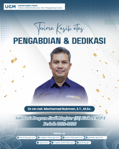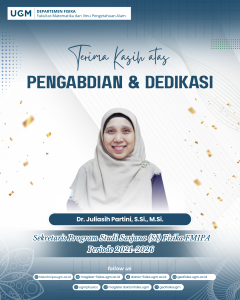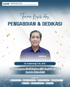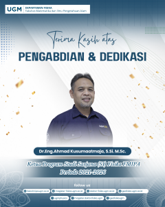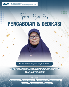 Departemen Fisika Fakultas Matematika dan Ilmu Pengetahuan Alam (FMIPA) Universitas Gadjah Mada menyampaikan apresiasi dan penghargaan setinggi-tingginya kepada seluruh jajaran pengurus Departemen Fisika FMIPA UGM Periode 2021–2026 atas dedikasi, komitmen, serta kontribusi yang telah diberikan dalam menjalankan tugas dan tanggung jawab akademik maupun kelembagaan.